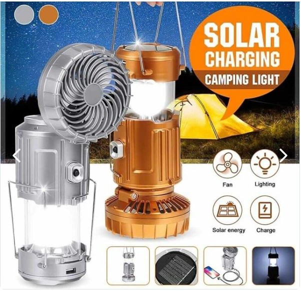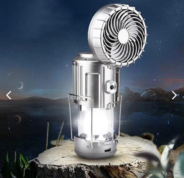 Con la Luz de Campamento o Emergencia con Ventilador y Cargador de Celular, mantén la luz, la frescura y la conexión en todo momento. ¡Tu compañero esencial para cualquier situación!